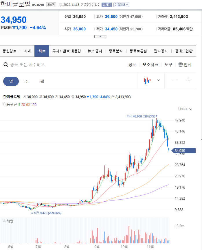 하지만 차익 실현 매물의 등장으로 인해 고점 대비 28% 하락한 상황입니다. 네옴시티 사업과 관련이 있으면 주가가 더 오를 수도 있으나, 네옴시티와 관련이 없다고 한다면 주가 회복이 확실치 않은 상황입니다.