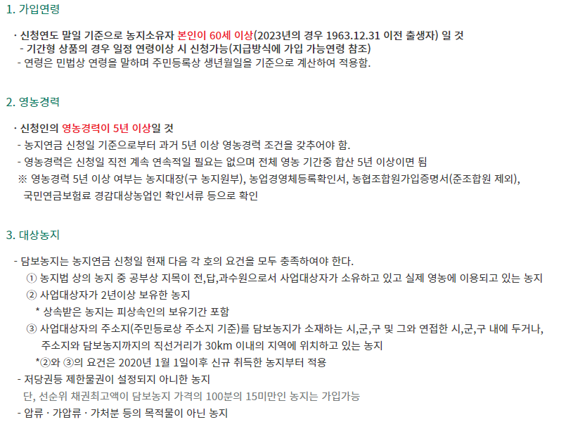 농지연금에 가입하기 위해서는 몇가지 자격요건이 필요합니다. 그 조건은 아래 내용을 참고하시기 바랍니다.