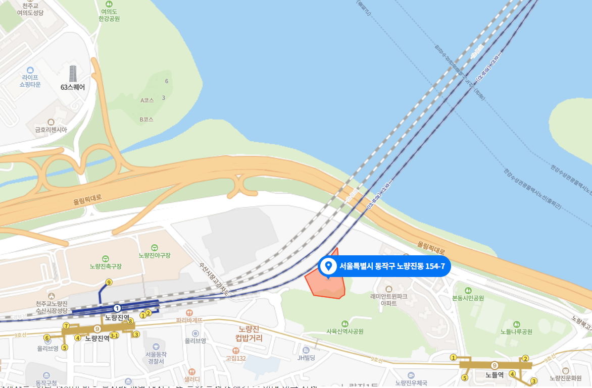 아래 사진에서 볼 수 있듯이 1, 9호선 노량진역과 9호선 노들역 사이에 위치해 있어 더블역세권에 해당합니다. 63 빌딩과 여의도한강공원은 물론 한강을 장애물 없이 조망하여 전망이 엄청 좋을 것으로 예상됩니다.