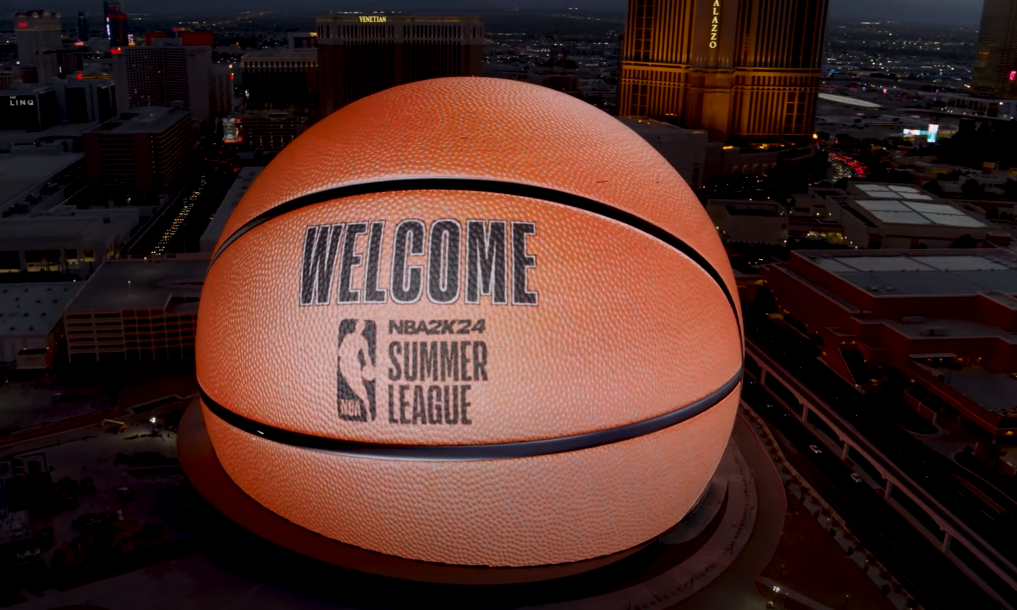 아래 사진은 2024 nba 썸머리그가 라스베이거스에서 열리는 것을 기념해 더 스피어에 환영문구를 보여주는 모습입니다.