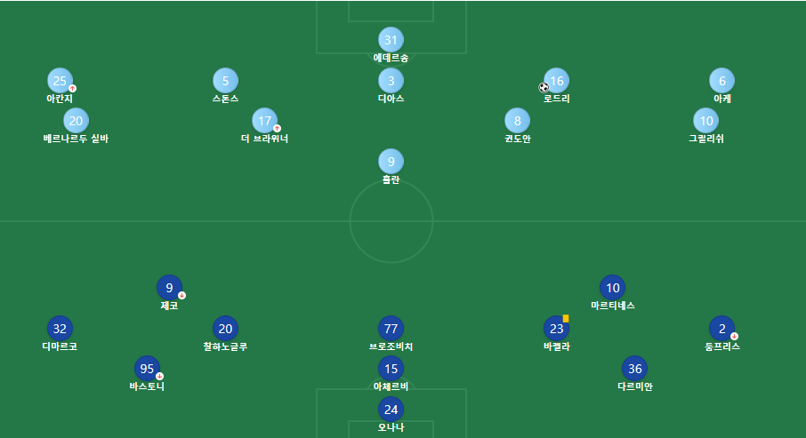 이번 경기의 MOM은 결승골을 올린 로드리도 중요하지만 후반 막판 3번이나 선방을 기록한 골키퍼 에데르송이었습니다. 인터밀란의 파상공세를 극적으로 막았기 때문에 결승골을 지킬 수 있었습니다.