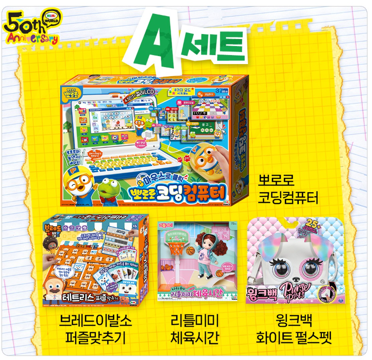 A세트에는 뽀로로코딩컴퓨터, 브레드이발소 퍼즐맞추기, 리틀미미 체육시간, 윙크백 퐈이트펄스펫이 들어있습니다.