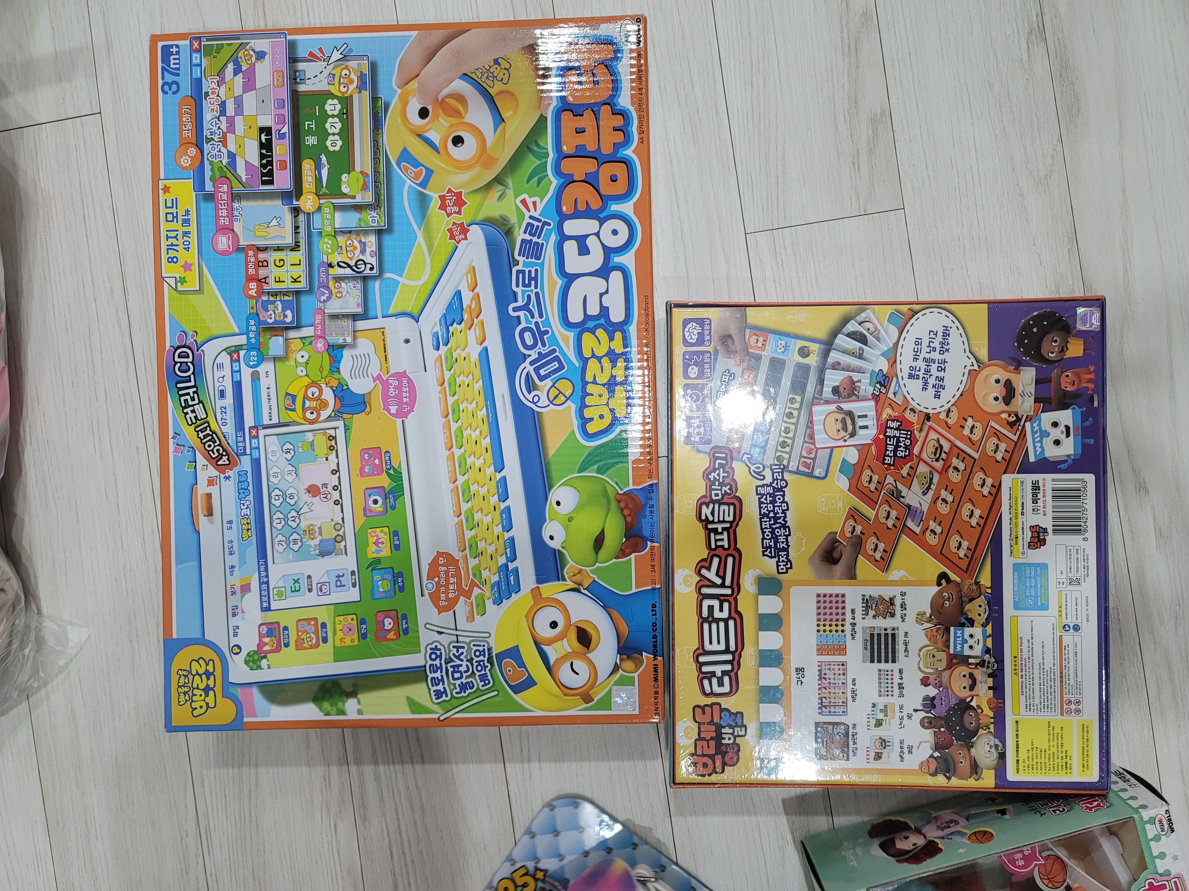 비치되어있는 박스를 들어보면 상자의 무게가 모두 다른데요. 가장 가벼운 것이 A세트로 뽀로로 코딩 컴퓨터가 들어있는 상품입니다.