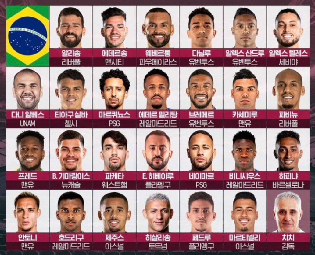 아래그림은 이번 카타르 월드컵에 출전하는 브라질 대표팀 선수 구성입니다.