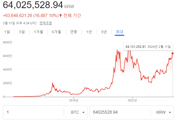 현재 2024년 2월 12일 한국의 빗썸 거래소 기준으로 비트코인 가격은 6400만 원입니다.