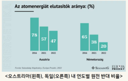 유럽의 경우에도 최근 천연가스의 가격이 상승하고, 석유 주권에 휘말리는 것에 벗어나 원자력으로 에너지원 부족사태를 해결하려 하고 있습니다. 여론만 보더라도 이제는 원자력을 반대하는 사람들이 많이 줄어들었습니다.