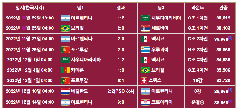 아래 그림에서 볼 수 있듯이 아르헨티나는 이 경기장에서 4경기를 치러본 만큼 프랑스에 비해 익숙하다는 장점이 있습니다. 프랑스는 이 경기장에서 경기를 치뤄본 경험이 없습니다.