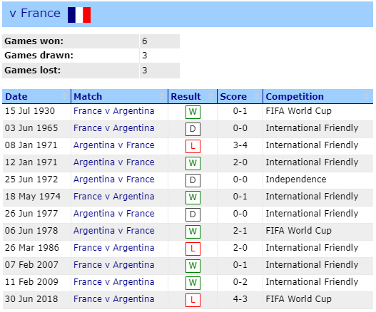 아르헨티나와 프랑스는 12번 만나 6승 3무 3패로 아르헨티나가 우세합니다. 과거는 과거일 뿐이지만 월드컵에서도 3번을 만나 아르헨티나가 2승 1패의 전적을 거두고 있습니다.