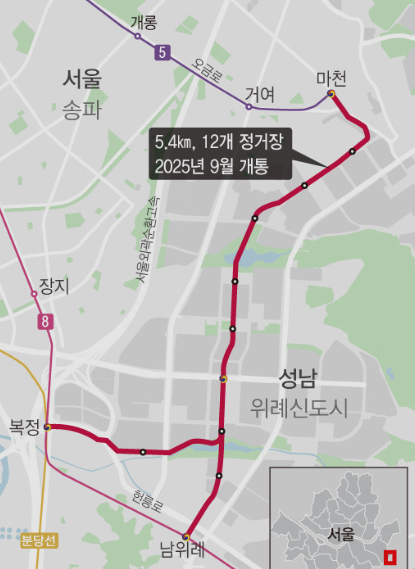 아래 사진과 같이 위례신도시 중심을 가로지르기 때문에, 도시 주변부와 중심부 모두 대중교통 이용에 큰 장점이 될 것입니다.
