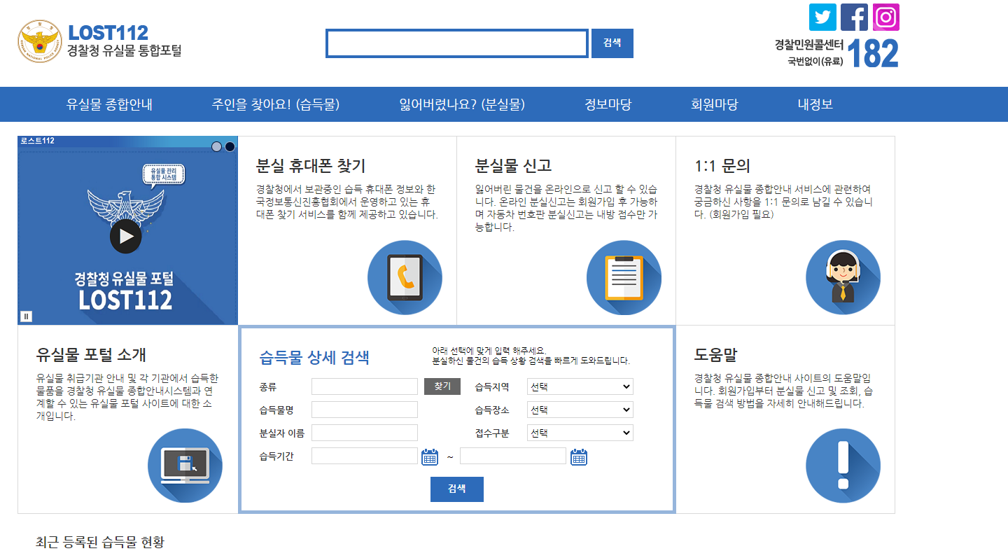 경찰청 유실물 포털 LOST112라는 사이트가 있습니다.