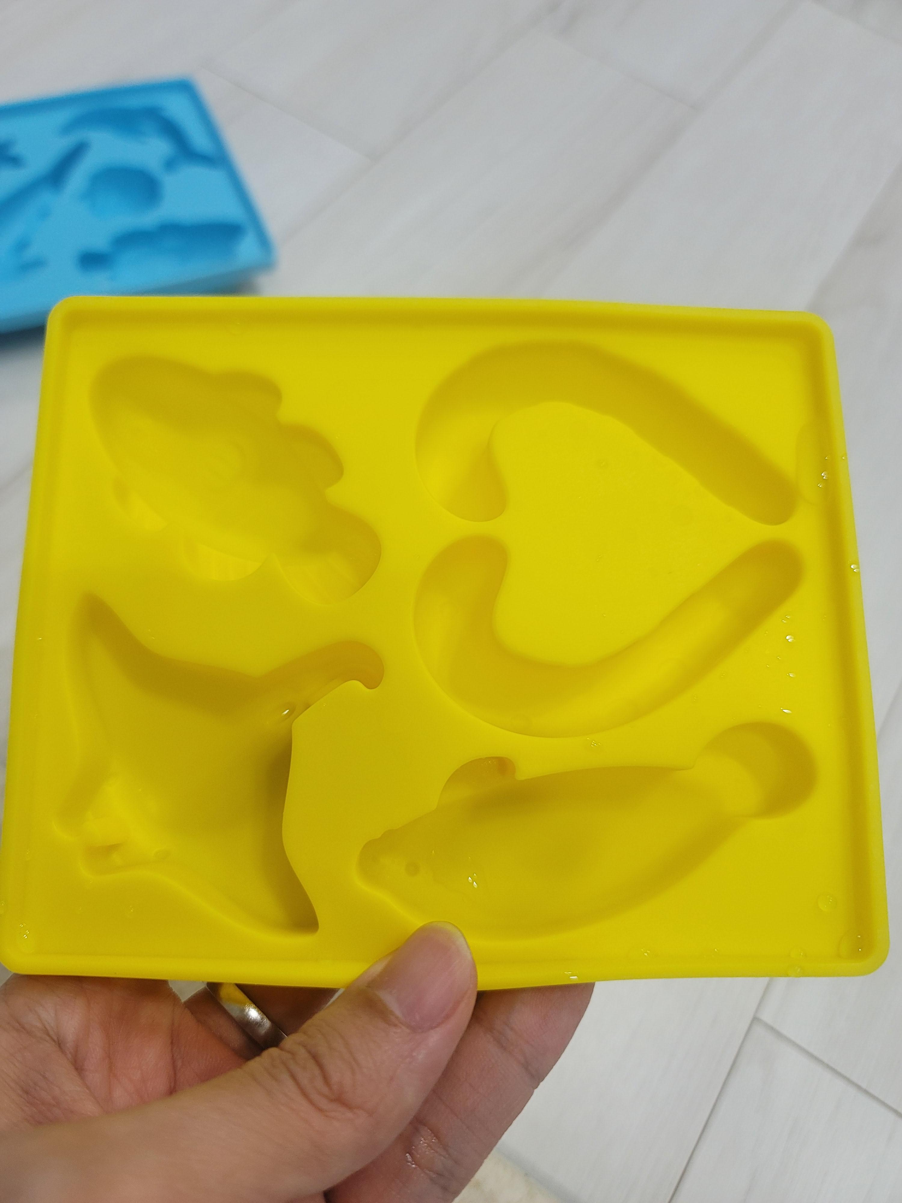 바로 '바다생물 얼음 트레이' 입니다. 실리콘 재질로 만들어진 트레이에 물이나 음료를 채워 얼리는 건데요, 모형에는 츄라우미 수족관의 대표격인 고래상어를 비롯해 거북이, 가오리, 조개 등 다양한 동물이 포함되어 있습니다.