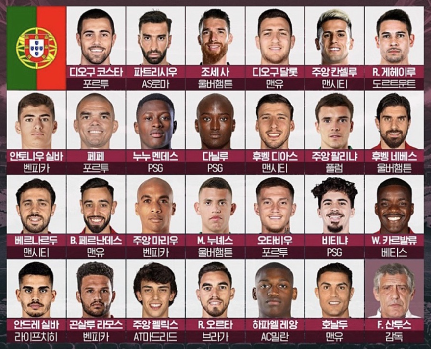 포르투갈 선수들의 평균 몸값은 2987만 유로로 우리나라 선수들의 458만 유로에 비해 거의 6배 수준입니다. 포르투갈 선수들의 소속팀을 살펴보면 맨시티, PSG, AC밀란 등 세계 빅클럽에 소속된 경우가 대부분입니다.