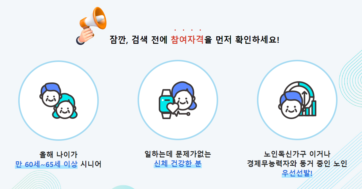 노인일자리는 만 60세 이상이라면 누구나 참여가 가능합니다. 하지만 사업별로 65세 이상인 경우도 있으니 꼭 참여하고자 하는 노인일자리의 자격정보를 확인하신 후 신청하시기 바랍니다.