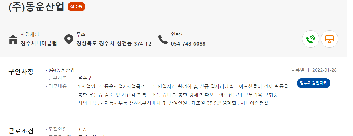 3. 본인이 원하는 일자리를 클릭하면 사업체 정보와 함께 구인사항, 근로정보, 전형사항에 대해 알려드립니다.
