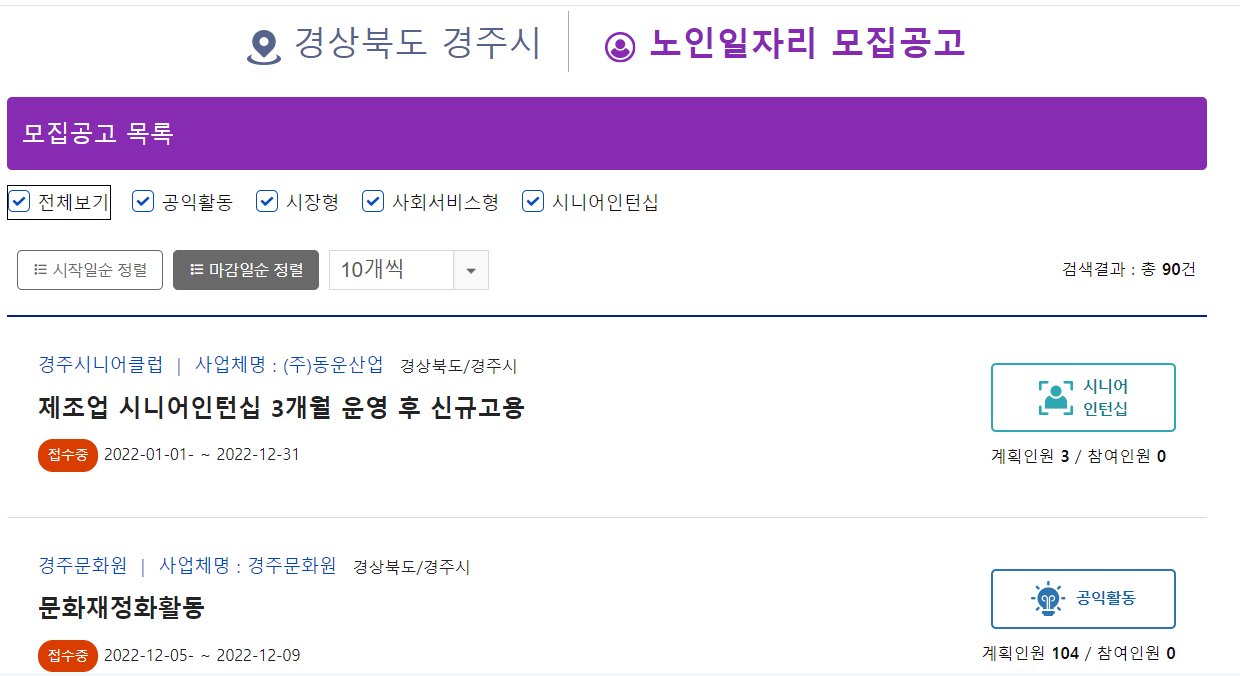 2. 아래로 내려가면 접수 중인 일자리에 대한 리스트가 나옵니다.